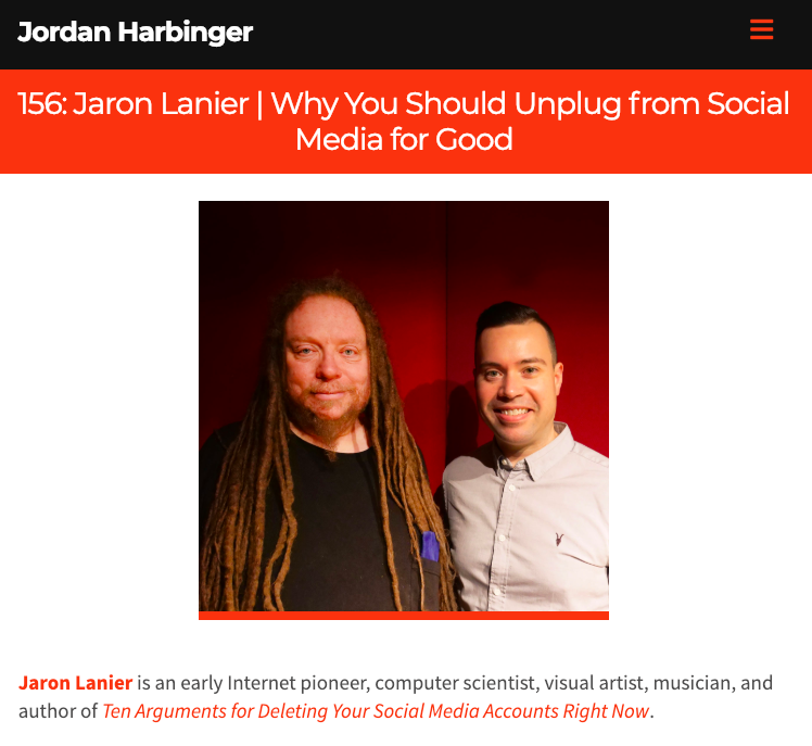 Podcast from Jordan Harbinger 156: Jaron Lanier / “Why You Should Unplug from Social Media for Good”