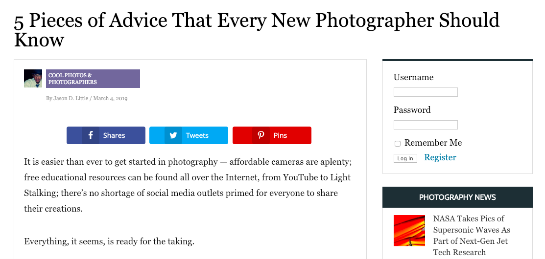 The article that I thought really helped me become a better photographer was “5 pieces of advice every new photographer should know”