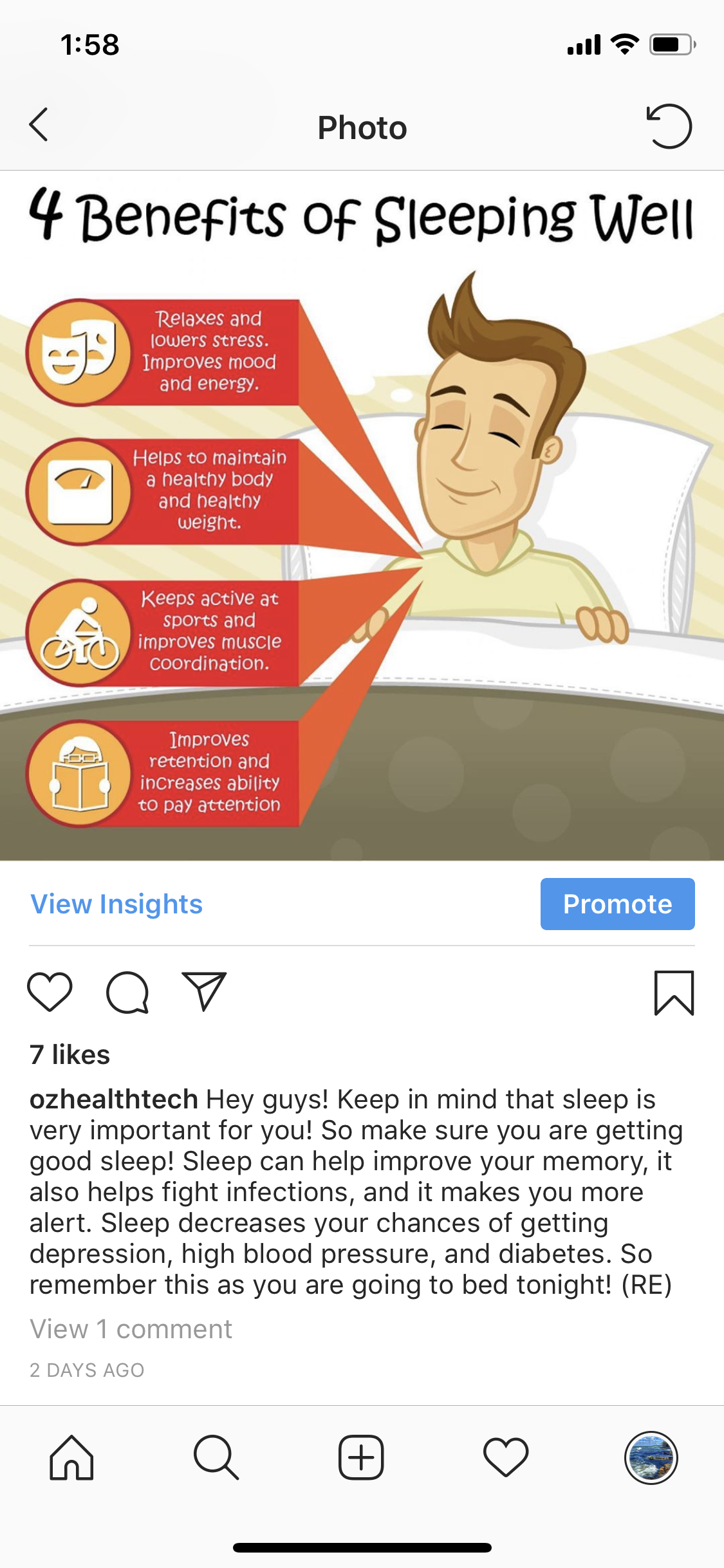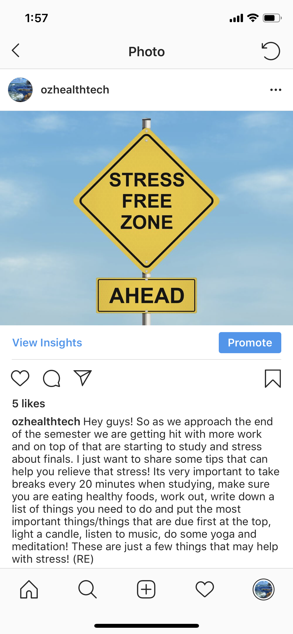 Hey guys! So I have been posting on the class Instagram account! I have been posting things relating to how to live a healthy lifestyle, ranging from why it is important to get good sleep, how to deal with stress during finals week, benefits of eating healthy, and why it is so important to stay physically active.