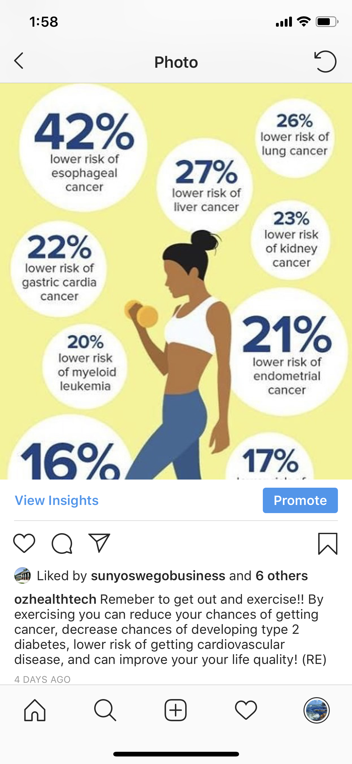 Hey everyone! So for round 5 group projects I took over the class Instagram for about 5-6 days. My posts were about how to live a healthy lifestyle. I posted a variety of things such as why sleep is important for you at night, how to deal with stress during finals week, how to eat better, and why being physically active is so important.