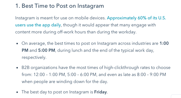 I read an article about the best time to post on different social media platforms but I will explain the best time to post on instagram as that is what I took over this week. According to the article about 60% of people who have this app use it daily and that people who use this app, usually use it after work and not typically during the day. The article states that the best time to post on instagram is at 1:00 pm which is lunch time and around 5:00 pm which is when most people finish work. It also says that more people go on late in the night such as 8:00-9:00 pm because that is when people are relaxing from the their day and getting ready for bed. Then the article states that the best day to post is on a Friday.